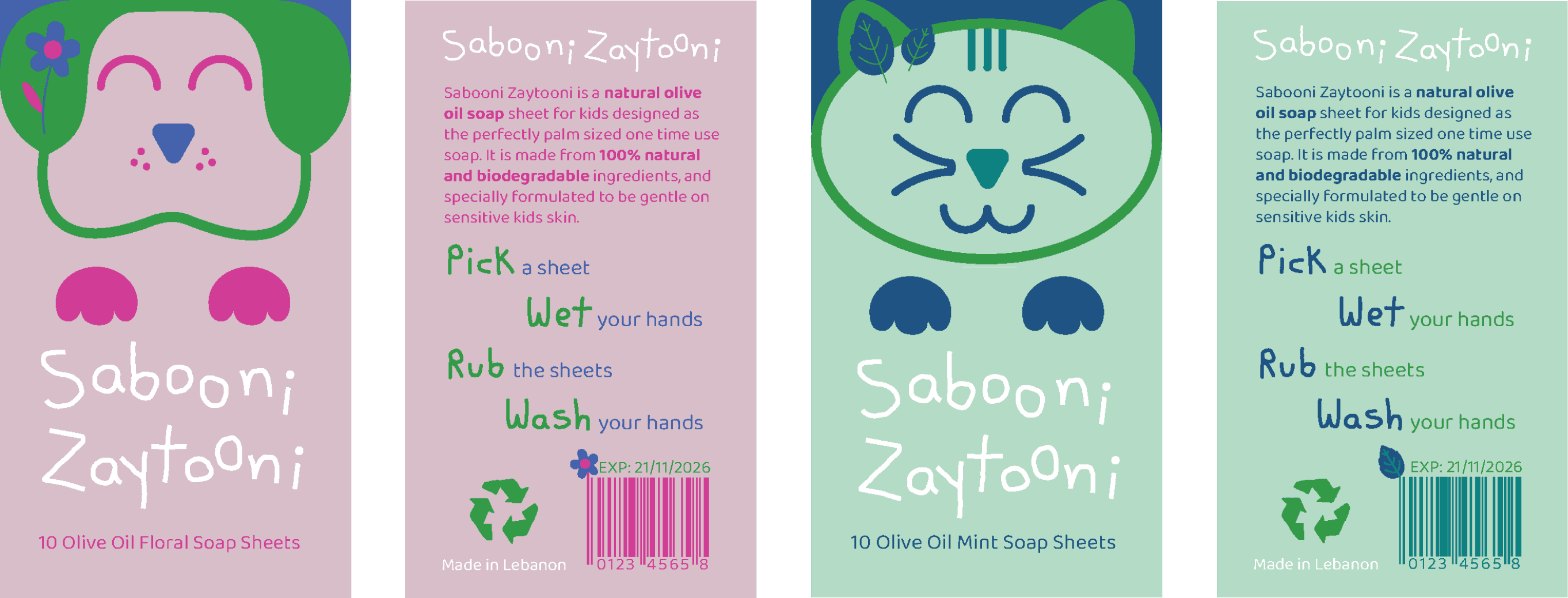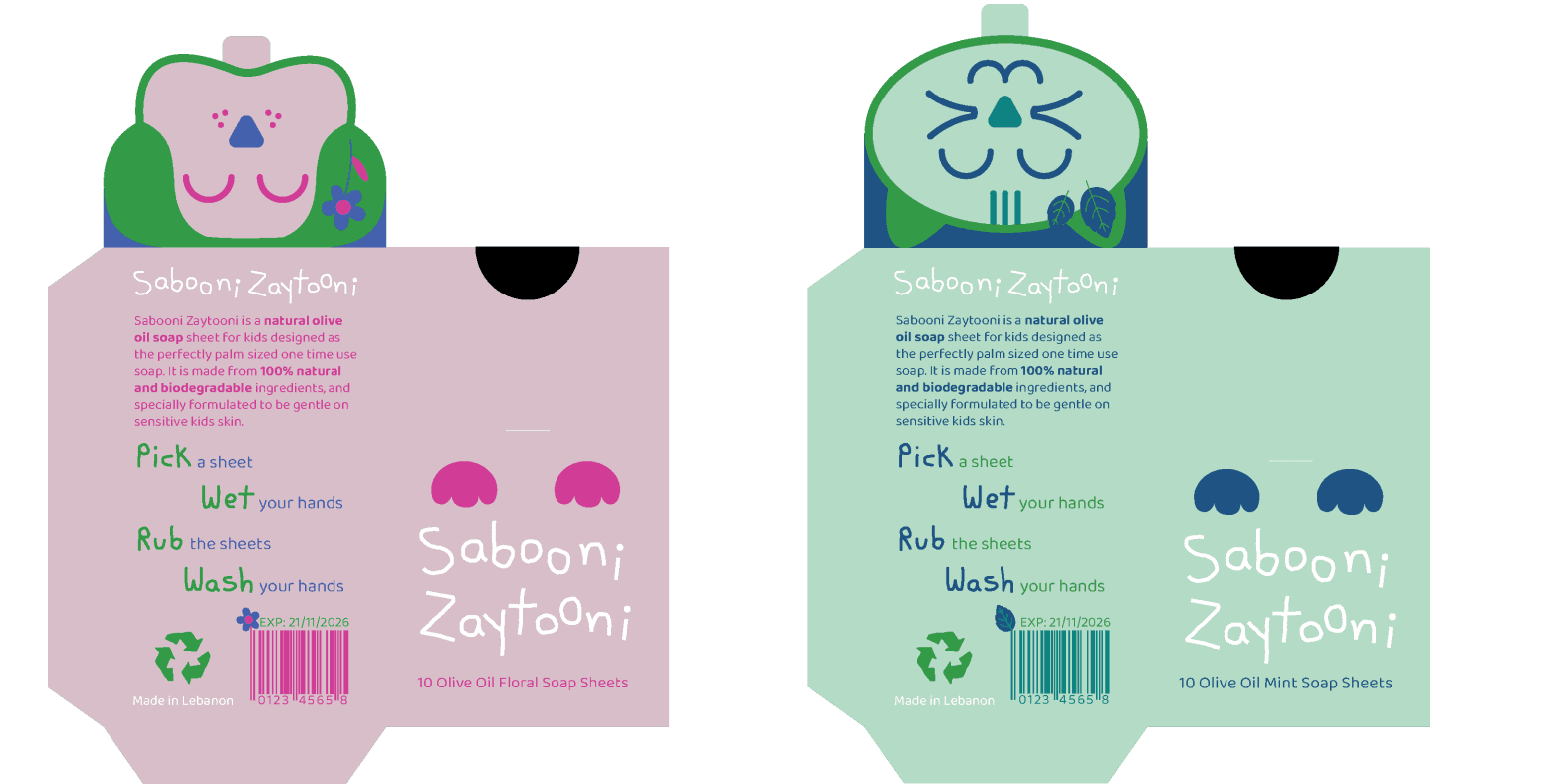 Sabooni Zaytooni is a natural olive oil soap sheets brand designed as the perfectly sized one time use soap for kids. Made from 100% natural and biodegradable ingredients, it is specially formulated to be ultra-gentle on sensitive kids’ skin. The word “Zaytooni” conveys the image of a tiny olive, symbolizing the soap’s small size tailored for kids while emphasizing its olive oil-based formula.